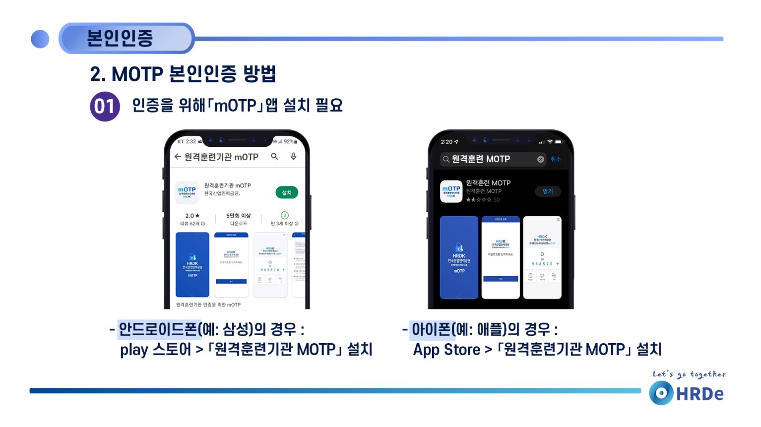 어플 설치 > 어플내훈련생정보입력 > 나의 학습실에서 mOTP 인증 실행